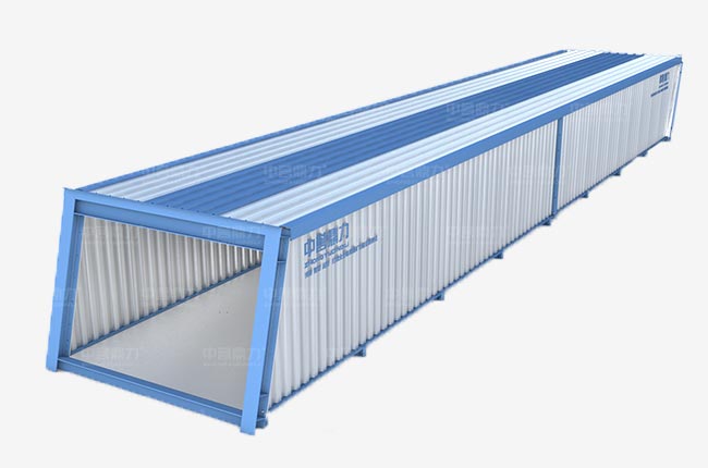 中譽鼎力DL組裝式廊道外形似箱,兩側無遮擋,除去機架(底架、側梁、上架、側梁、加強撐等),還包括頂部采光板、側邊波紋腹板、電纜橋架槽盒、攝像頭安裝位置、照明燈安裝位置燈。