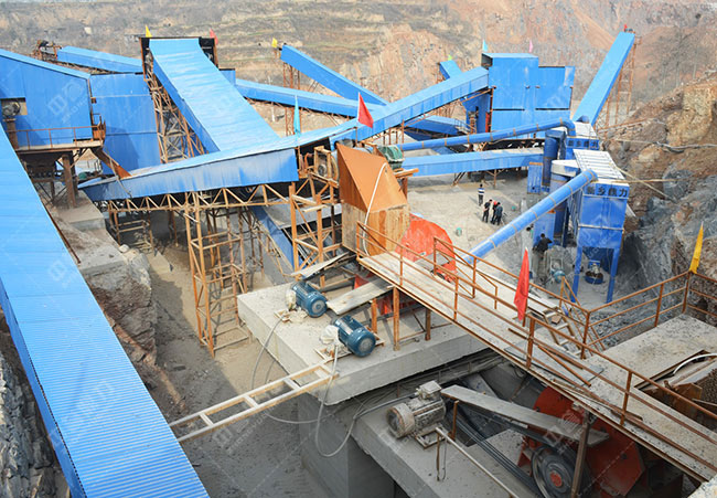 石料從山上爆破下來,通過自卸車將小于600mm的石料送入振動(dòng)給料機(jī),振動(dòng)給料機(jī)把石料均勻的送入錘式破碎機(jī),錘式破碎機(jī)對(duì)石料進(jìn)行段破碎,從錘破出來的石料在120mm以下,再通過皮帶機(jī)輸送至反擊破進(jìn)行二級(jí)破碎,破碎后的物料由皮帶機(jī)輸送至制砂機(jī)進(jìn)行細(xì)碎,細(xì)碎后的物料再通過圓振篩進(jìn)行粗砂、中砂、細(xì)砂等規(guī)格的篩分。對(duì)于砂子含粉量要求嚴(yán)格的可在細(xì)砂后面加配洗砂機(jī),洗砂機(jī)排放的污水可再經(jīng)細(xì)砂回收機(jī)進(jìn)行回收,一方面減少環(huán)境污染,另一方面可提高制砂產(chǎn)量。